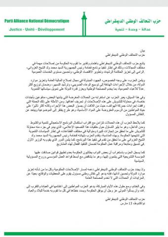 أبدى حزب التحالف الوطني الديمقراطي - يرأسه وزير التعليم العالي يعقوب ولد أمين -استغرابه مما اعتبره حملات مغرضة ومدفوعة بأجندات خاصة للتشويش على الإصلاحات وتحريف أهدافها وخاصة الحملة المرافقة لإجراءات جمركة الهواتف المحم