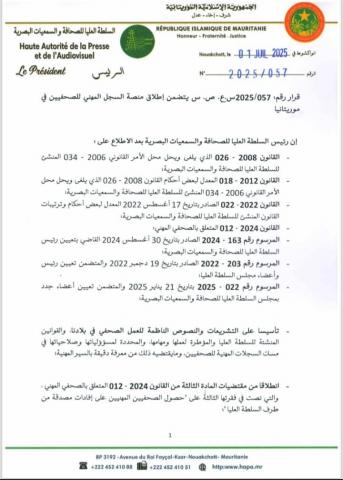 أصدرت السلطة العليا للصحافة والسمعيات البصرية اليوم الثلاثاء 22 يوليو قراراها الخاص بإطلاق منصة السجل المهني للصحفيين في موريتانيا، تأسيسا على التشريعات والنصوص الناظمة للعمل الصحفي، والقوانين المنشئة للسلطة العليا والمؤطرة لعملها ومهامها، والمحددة لصلاحياتها في مسك السجلات المهنية للصحفيين والعاملين في القطاع.