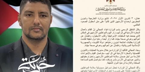 أكدت وزارة الخارجية وشؤون المغتربين أنها تابعت أوضاع الأردنيين ورعايا الدول العربية الذين كانوا على متن أسطول الصمود العالمي حيث قام القائم بأعمال السفارة الأردنية في تل أبيب .