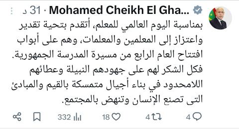 تقدم الرئيس محمد ولد الغزواني بتحية تقدير واعتزاز إلى المعلمين والمعلمات، بمناسبة اليوم العالمي للمعلم.