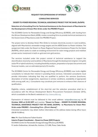 وعبر مركز الطاقة المتجددة وكفاءة الطاقة التابع للمجموعة الاقتصادية لدول غرب أفريقيا (ECOWAS)، بتمويل من البنك الأفريقي للتنمية (ADB) عن الرغبة في التعاقد مع شركات استشارية لتقديم المساعدة الفنية للحكومة الموريتانية في إطار مشروع PROREV.