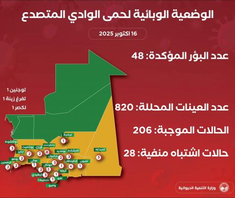 و تواجه موريتانيا حاليا موجة من وباء حمى الوادي المتصدع الذي سجلت أول بؤرة منه يوم 15 سبتمبر 2025 في قرية الشام التابعة لبلدية دار البركه في مقاطعة بوكى بولاية لبراكنة.