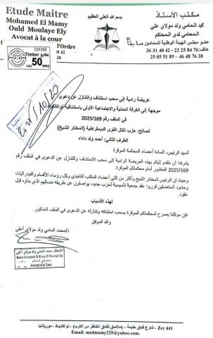 وتقدم جناح المختار الشيخ عبر محانيه، بعريضة إلى لغرفة المدنية والاجتماعية الأولى باستئنافية نواكشوط لسحب الاستئناف والتنازل عن الدعوى.