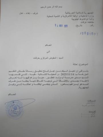 أمر حاكم مقاطعة عرفات بنواكشوط الجنوبية، المفوض المركزي للشركة بعرفات بفتح تحقيق في مزاعم حول اعتداء أحد وكلاء التلاميذ على مدير مدرسة آب ولد اخطور.