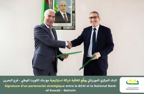 استقبل اليوم محافظ البنك المركزي الموريتاني، السيد محمد الأمين الذهبي، الرئيس التنفيذي لبنك الكويت الوطني – البحرين، السيد علي يوسف فردان، حيث تم التوقيع على اتفاقية شراكة استراتيجية بين المؤسستين.