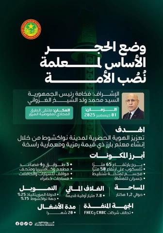 وضع رئيس الجمهورية محمد ولد الشيخ الغزواني مساء اليوم حجر الأساس لمعلمة " نصب الأمة "بمقاطعة لكصر وقد نشرت المصادر الرسمية معلومات حول المعلمة الجديدة بنواكشوط .