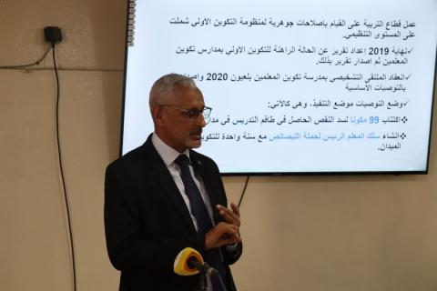 كما تم عرض مسار إصلاح التكوين الأولي بدءا باختيار خبير لتشخيص واقع التكوين داخل مدارس تكوين المعلمين، و ختاما بتطبيق التوصيات التي خلص إليها تقرير الخبرة، و زيادة عدد المكونين في المؤسسة، وتدريس اللغات الوطنية، واشتراط معدلات محددة في المواد الأساسية، وتقليص مدة التكوين من ثلاث سنوات إلى سنتين، على أن تكون السنة الثالثة سنة تربص في الميدان.