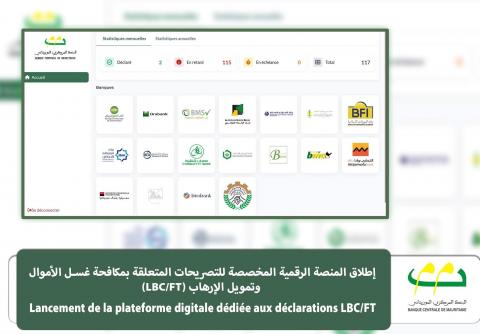 أطلق البنك المركزي الموريتاني منصة رقمية جديدة مخصصة للتصريحات التنظيمية الشهرية والسنوية الخاصة بالمؤسسات الخاضعة للرقابة و ذلك في إطار تعزيز المنظومة الوطنية لمكافحة غسل الأموال وتمويل الإرهاب (LBC/FT)،