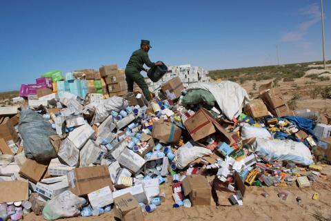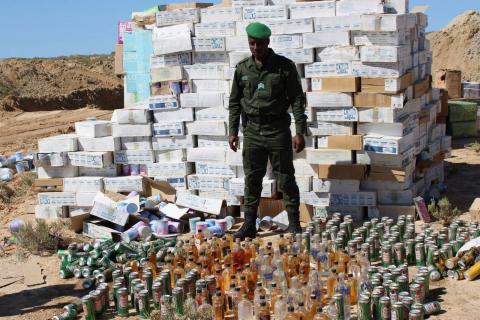 ومن بين المواد المتلفة مئات قنينات الخمور وكميات من المواد الغذائية المنتهية الصلاحية والممنوعات.