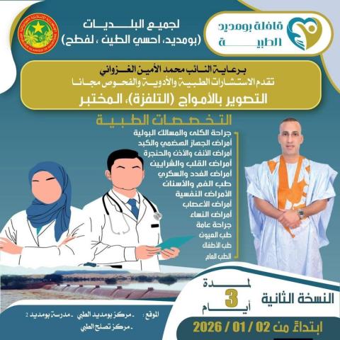 انطلقت النسخة الثانية من قافلة بومديد الصحية، التي يسيرها و يشرف عليها نائب المقاطعة النائب محمد الأمين ولد الغزواني، الملقب " حدمين " و بمشاركة طاقم صحي كبير يضم أخصائيين و أطباء عامين، و ممرضين.