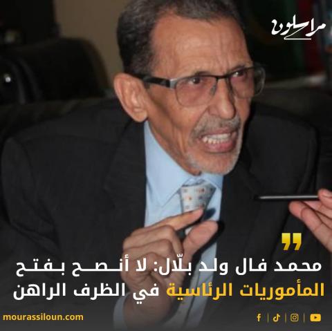 قال القيادي في حزب جبهة المواطنة والعدالة، محمد فال ولد بلال، إنه لاينصح بفتح المأموريات الرئاسية في الظرف الراهن.