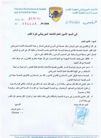 أكدت العصبة الجهوية لكرة القدم في ولاية آدرار دعمها الكامل لنادي أنزيدان في ما وصفته معركته القانونية لدى لجنة الانضباط بالاتحاد الوطني لكرة القدم .