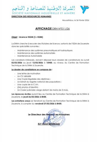 أعلنت الشركة الوطنية للصناعة والمناجم " اسنيم " عن اكتتاب لمجموعة من خريجي المعهد العالي لمهن المعادن بازويرات.