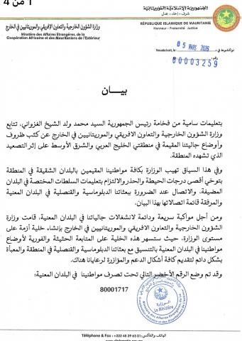 دعت وزارة الشؤون الخارجية والتعاون الإفريقي والموريتانيين في الخارج أفراد الجالية الموريتانية المقيمين في منطقة الخليج العربي والشرق الأوسط إلى الحيطة والحذر وذلك على خلفية ماتشهده المنطقة.