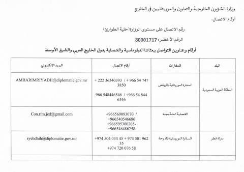 و أعلنت الوزارة عن وضع رقم أخضر تحت تصرف المواطنين الموريتانيين في البلدان المعنية وهو: 80001717.