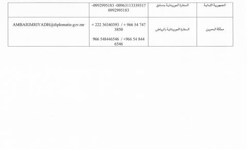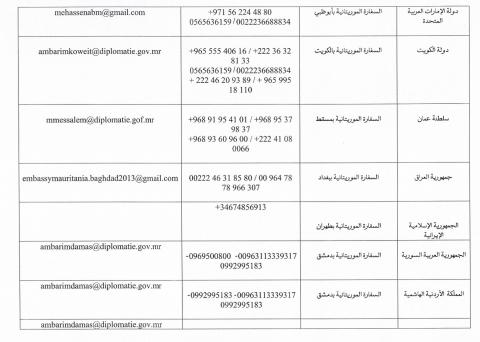وطالبت الوزارة المواطنين الموريتانيين في البلدان المعنية الالتزام بتعليمات السلطات المختصة في البلدان المضيفة والتواصل عند الضرورة مع البعثات الدبلوماسية والقنصلية الموريتانية في تلك البلدان مشيرة إلى أن قائمةً بأرقام الاتصال مرفقة بالبيان ( البيان + والأرقام في الأسفل ) .