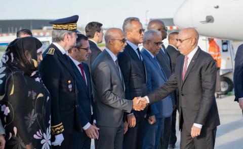وحظي الرئيس غزواني لدى وصوله المطار باستقبال رسمي، وشعبي من قبل أفراد الجالية الموريتانية بفرنسا.