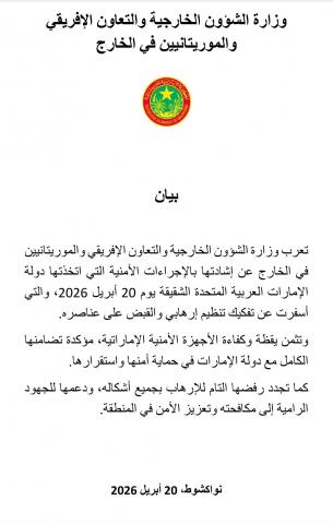 تعرب وزارة الشؤون الخارجية والتعاون الإفريقي والموريتانيين في الخارج عن إشادتها بالإجراءات الأمنية التي اتخذتها دولة الإمارات العربية المتحدة الشقيقة يوم 20 أبريل 2026، والتي أسفرت عن تفكيك تنظيم إرهابي والقبض على عناصره.