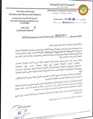 ألزمت وزارة المعادن والصناعة ممثلي الشركات الحاصلة على رخص البحث إلى الالتزام والتقيد بإيداع تقارير أنشطة البحث المنجزة .