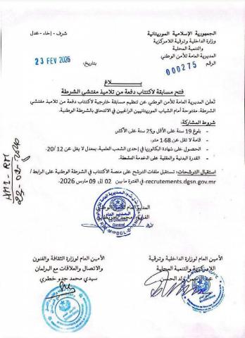 أشرف وزير الداخلية وترقية اللامركزية والتنمية المحلية، محمد أحمد ولد محمد الأمين، باسم رئيس الجمهورية، على حفل توشيح عدد من أطر وموظفي القطاع، ومنتسبي الحرس الوطني والشرطة الوطنية والأمن المدني، وذلك بمقر قيادة أركان ال