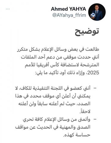 طالعت في بعض وسائل الإعلام بشكل متكرر أنني حددت موقفي من دعم أحد الملفات المترشحة لاستضافة كأس أفريقيا للأمم 2025، وإزاء ذلك أود تأكيد ما يلي: