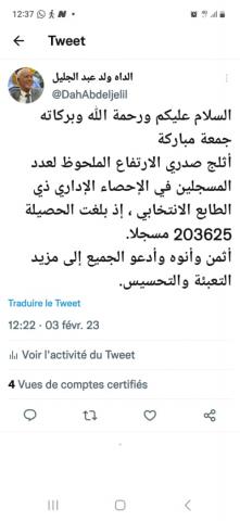 قال رئيس اللجنة المستقلة للانتخابات الداه ولد عبد الجليل إنه مسرور بالرقم الذي وصل إليه عدد المسجلين في الاحصاء الإداري ذي الطابع الانتخابي حيث وصل إلي 203625 بعد 7 أيام من انطلاقه حيث بدأ الاحصاء يوم 27 يناير المنصرم