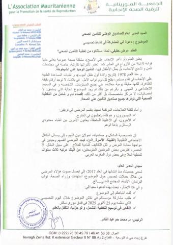 جاء ذلك في رسالة وجهتها الجمعية للمؤسسة للمشاركة في يوم تحسيسي ستنظمه يوم 25 أكتوبر 2025 في فندق موري سانتر بنواكشوط.
