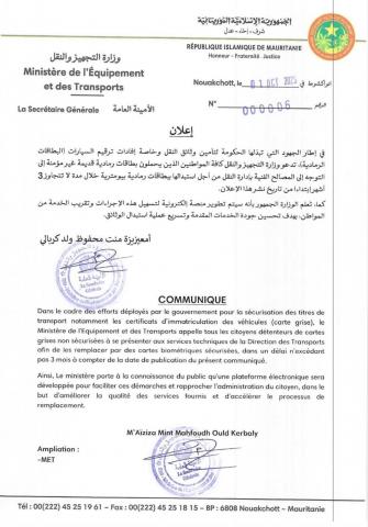 دعت وزارة التجهيز والنقل المواطنين الذين يحملون بطاقات رمادية قديمة غير مؤمنة إلى التوجه إلى المصالح الفنية بإدارة النقل لاستبدالها ببطاقات رمادية بيومترية.