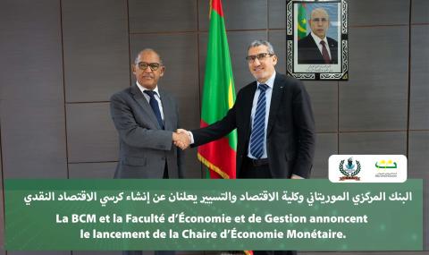 أُعلن اليوم رسميًا عن إطلاق كرسي الاقتصاد النقدي، وهو إطار أكاديمي جديد للتعاون بين البنك المركزي الموريتاني وكلية الاقتصاد والتسيير، يهدف إلى تعزيز الصلة بين البحث العلمي وصنع القرار في السياسات الاقتصادية والمالية.