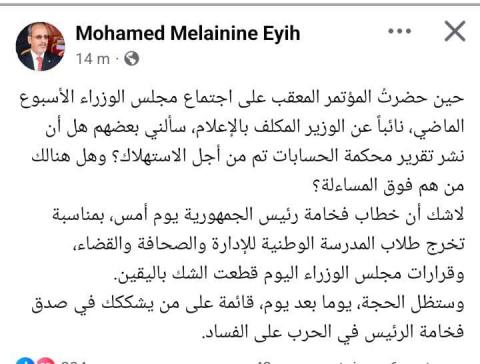 قال الوزير ماء العينين ولد أييه إنه في المؤتمر الصحفي اليوم سُأل عن نشر تقرير محكمة الحسابات و فرق المساءلة وأكد وزير التكوين المهني والصناعة التقليدية والحرف في تدوينة له على حسابه أن خطاب الرئيس أمس والقرارات المتخذة اليوم في مجلس الوزراء حجة على من يشكك في مصداقية الرئيس .