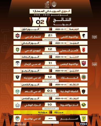 و قررت لجنة المسابقات تأجيل مباراة ديربي العاصمة الاقتصادية بين أفسي نواذيبو واسنيم ضمن ذات الجولة إلى أجل لم يحدد بعد وذلك بسبب مشاركة البرتقالي في دوري أبطال إفريقيا حيث يخوض لقاء العودة ضد الملعب المالي مساء الأحد في الدور التمهيدي الثاني .