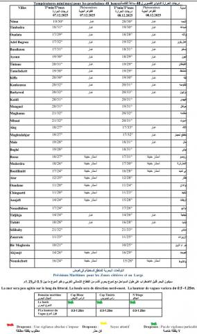 أكدت الهيئة الوطنية للأرصاد الجوية أن الطقس من يوم 6 حتى 8 من دجمبر الجاري سيتميز الطقس بهبوب رياح ضعيفة الى معتدلة شرقية إلى شمالية شرقية على عموم البلاد.