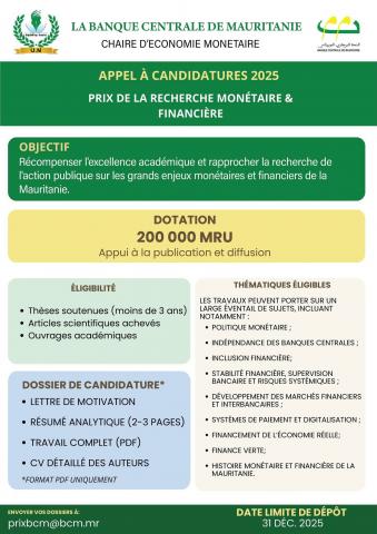 أعلن البنك المركزي الموريتاني عن الإطلاق الرسمي لجائزة البحث النقدي والمالي، وهي جائزة مخصصة لتشجيع وإبراز الإنتاج العلمي المرتبط بمهام المؤسسة و ذلك من خلال كرسي الاقتصاد النقدي،.