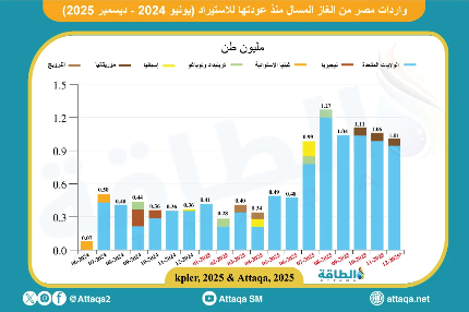 جاء ذلك وفق بيانات حصرية حصلت عليها وحدة أبحاث الطاقة تكشف أن واردات مصر الإجمالية سجلت قفزة تاريخية بنمو تجاوز 200%، إذ استوردت القاهرة نحو 9 ملايين طن في 2025، مقابل نحو 2.8 مليونًا في 2024.