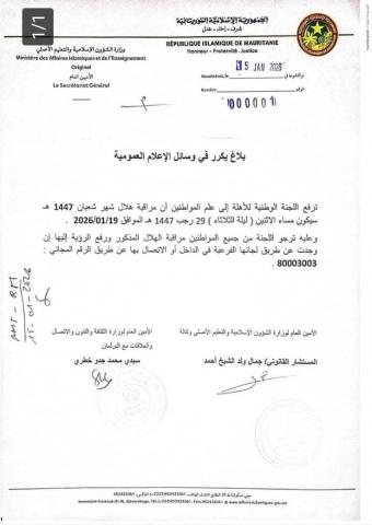 دعت اللجنة الوطنية للأهلة إلى مراقبة هلال شهر شعبان 1447 هـ، مساء الاثنين ( ليلة الثلاثاء) 29 رجب 1447 هـ الموافق 2026/01/19. وطلبت اللجنة من المواطنين رفع الرؤية الهلال - إن وجدت - إليها عبر لجانها الفرعية، أو الا تصال بها 80003003.