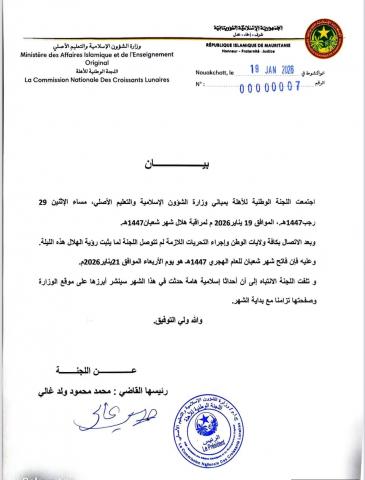 وبناء عليه أعلنت أن فاتح شهر شعبان للعام الهجري 1447هـ هو يوم الأربعاء الموافق 21 يناير 2026م.