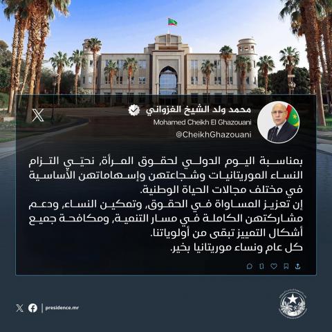 "بمناسبة اليوم الدولي لحقوق المرأة، نحيّي التزام النساء الموريتانيات وشجاعتهن وإسهاماتهن الأساسية في مختلف مجالات الحياة الوطنية.