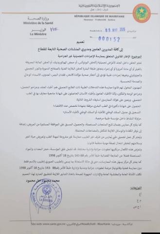 وزادت الوزراة في التعميم على ضرورة توفر شروط محددة لممارسة هذا النشاط من بينها الحصول على شهادة دكتوراه في الطب والتسجيل في السلك الوطني للأطباء أو أطباء الأسنان، إضافة إلى مزاولة النشاط داخل مؤسسة صحية مرخصة.