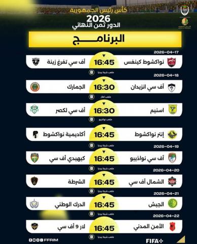 تفتتح اليوم مباريات دور 16 من كأس رئيس الجمهورية بمواجهة تجمع بين نواكشوط كينغ وتفرغ زينة على ملعب شيخا بيديا .