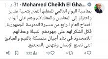 وتوجه الغزواني بالشكر للمعلمين على "جهودهم النبيلة وعطائهم اللامحدود في بناء أجيال متمسكة بالقيم والمبادئ التي تصنع الإنسان وتنهض بالمجتمع".